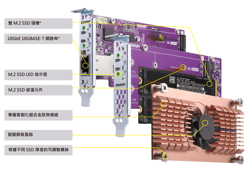QM2-2P410G2T 提供具 PCIe 4.0 扩展槽的 NAS 机种机型提升效能性能的绝佳不二选择。不占硬盘空间的 M.2 SSD 配置更加分,让您轻松享有储存存储空间扩极大化、效能性能优化的好处。