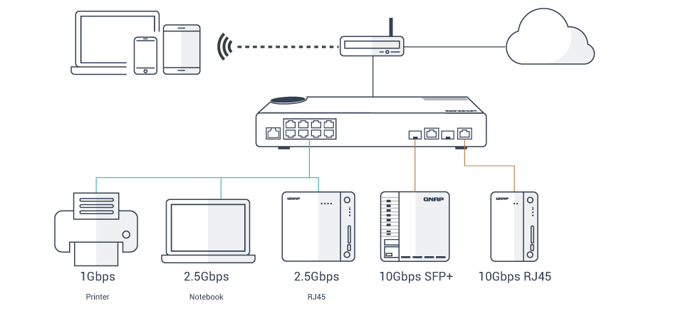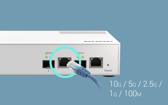 QSW-M2108-2C 的复合网络端口支持 10GBASE-T 和 Multi-Gigabit NBASE-T™ 技术,亦提供低速联机,向下兼容于传统装置,可支持达五速 (10G / 5G / 2.5G / 1G / 100M) 网络,使用原有的 Cat 5e 和 Cat 6a 线材即可弹性提升传输速度。依线材类型及其长度而定,可达到不同的连接速度,让数据传输更快、更有效率。