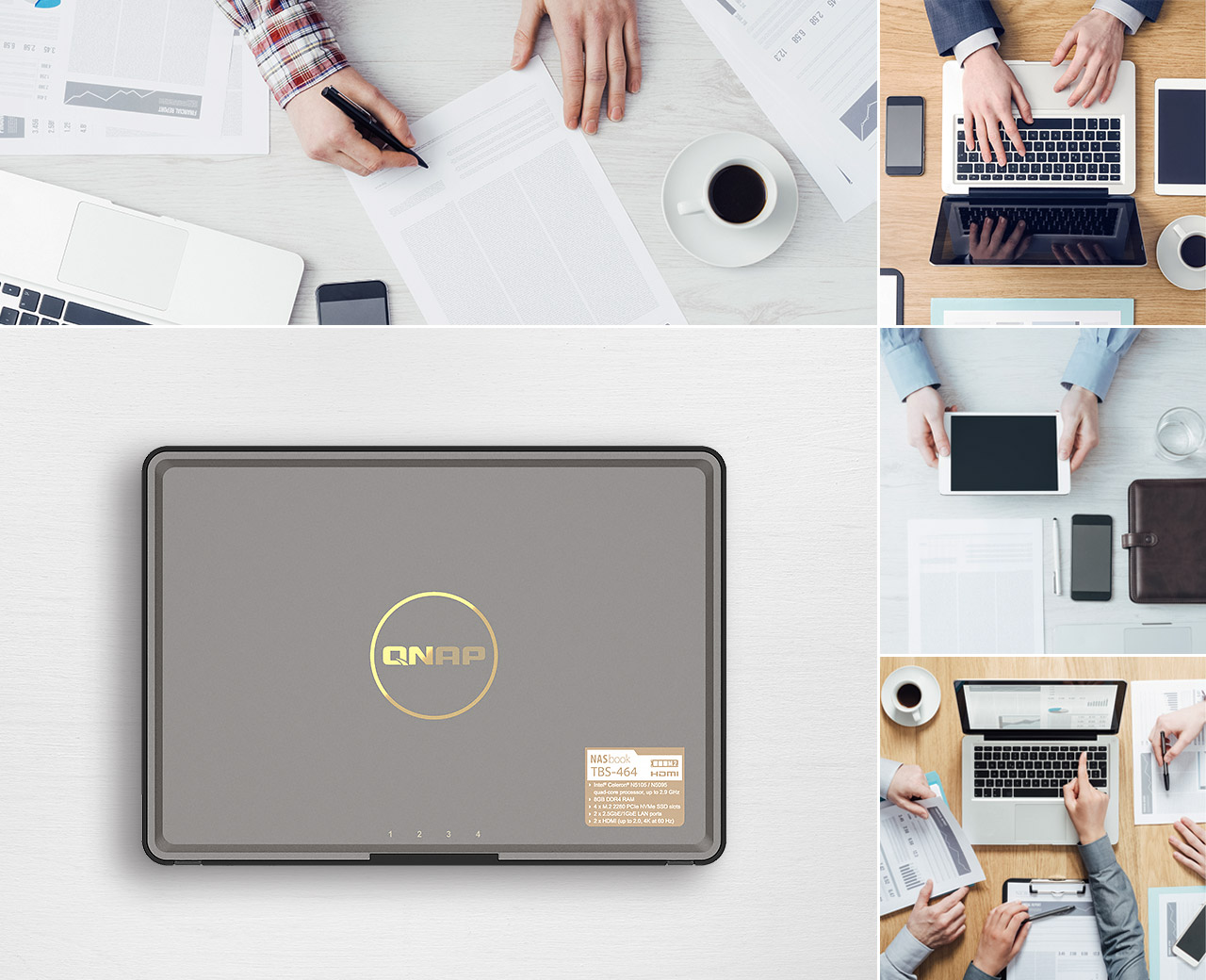 仅仅 B5 笔记本大小的 「NASbook」TBS-464,外型轻薄、简约有型,尺寸仅 1.18 x 9.06 x 6.50 英寸,重量仅 740 克,携带方便,非常适合办公室环境与移动工作者使用。您可随身携带办公、随时存取文件,工作伙伴们也可多人同时存取 TBS-464 中的数据,让工作、会议更有效率。有别于传统 NAS 搭载 3.5 英寸或 2.5 英寸硬盘,TBS-464 突破性地使用 M.2 NVMe SSD 固态硬盘,不仅体积更轻巧、噪音也更小,内附 SSD 散热片可有效散热,维持高速运转性能。安装或更换M.2 NVMe SSD 固态硬盘也十分简单,只须移除底部的脚垫与螺丝,便可轻松完成。除了笔电、手机,TBS-464 NASbook 也是您应该拥有优质工具!