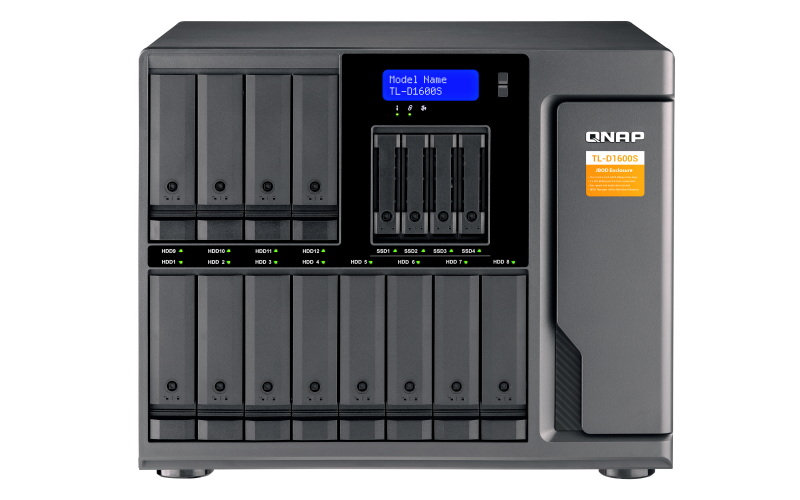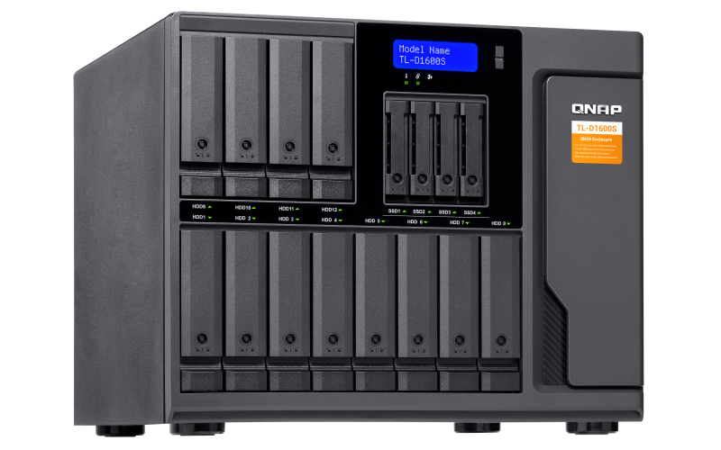 TL-D1600S JBOD 存储扩充设备提供您备份或扩充 QNAP NAS、Windows® 以及 Ubuntu® 计算机的新选择,其提供 16 个 SATA 6Gb/s 硬盘插槽,支持 3.5 英寸/2.5 英寸SATA 6Gb/s HDD 或 SSD,搭配内附的专属 QNAP QXP PCIe 多端口 SATA 扩充卡,即可透过高速 SFF-8088(或 SFF-8644)传输线连接 NAS 或计算机装置,不仅给您更有效的连续读写效能,还能让您享用更加效率及流畅的存储扩充及文件备份体验。