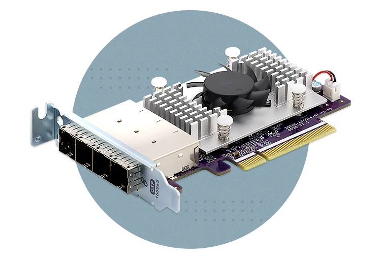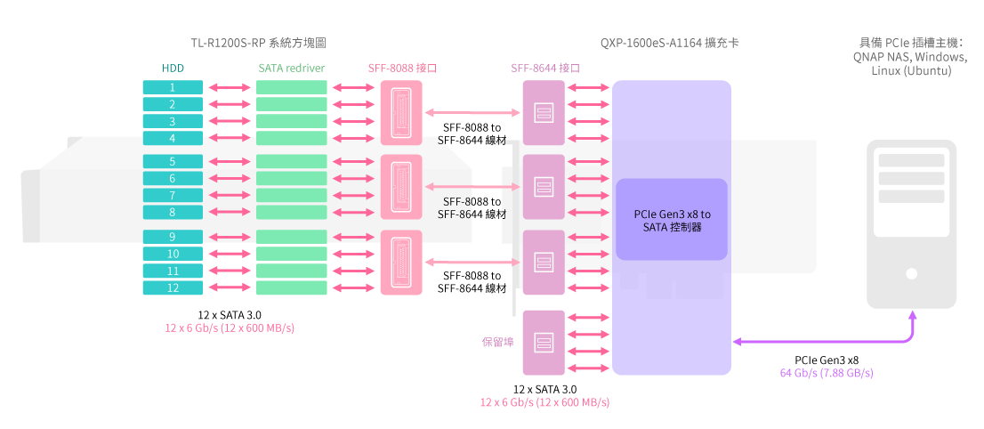 使用 TL-R1200S-RP 存储扩充设备,您需搭配专属的 QXP 扩充卡。将其安装于 QNAP NAS、Windows® 或 Ubuntu® 计算机及服务器的 PCIe 扩展槽,再透过 SFF-8088 (或SFF-8644) 传输线与 TL-R1200S-RP 串接,弹性扩充存储容量,即插即用,简易又弹性。