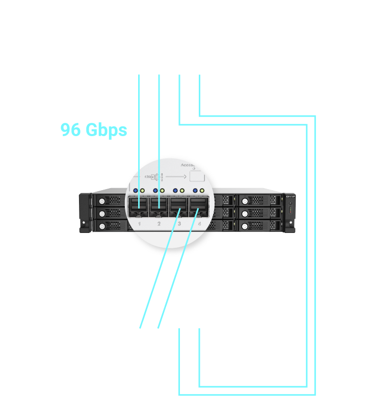 QNAP QTS/ QuTS hero NAS 主机,可安装 12Gb/s SAS 适配卡连接 TL-R1220Sep-RP,搭配 Broadcom® SAS DataBolt™ 线路带宽优化技术,提供智能型数据缓冲功能可将数据传输到多个硬盘,当数据自 NAS 主机传输至 TL-R1220Sep-RP 时,无论安装 12Gb/s 或 6Gb/s 的硬盘或 SSD,皆可维持 SAS 12Gbps 高速传输速度,让您透过现有的 6Gb/s 硬盘基础架构实现两倍、达 SAS 12Gb/s 的速度优势,大幅提升数据传输量和 IOPS 效能。