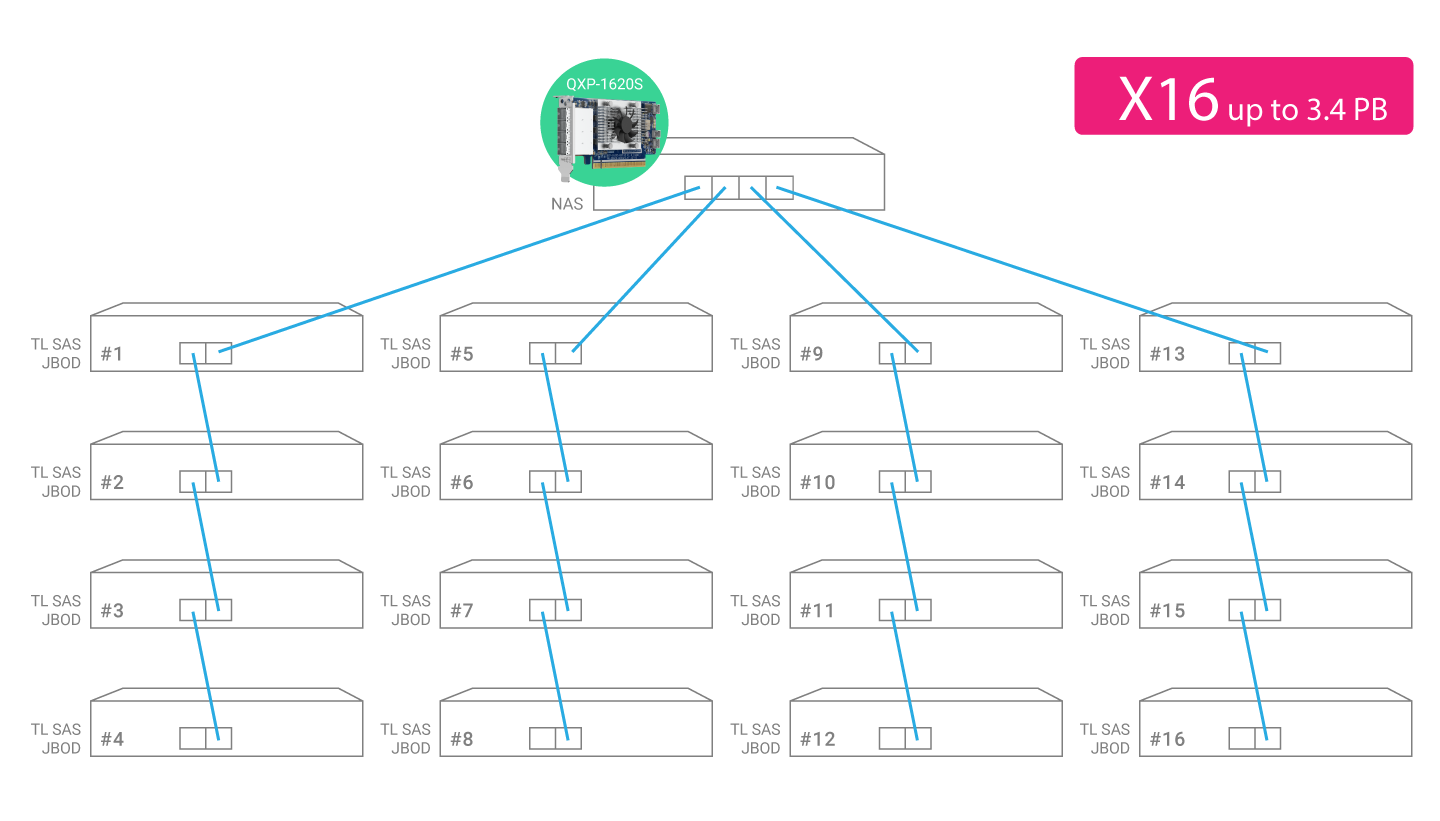 2. NAS 主机需安装一张 QXP-1620S-B3616W SAS 卡,并以单信道 (Singlepath) 方式串接 16 台 JBOD。若以多信道 (Multipath) 方式串接并启用带宽聚合功能,安装一张 QXP-1620S-B3616W SAS 卡的 NAS 主机可串接 4 台 JBOD,安装 2 张QXP-1620S-B3616W 的 NAS 主机可串接 8 台 JBOD。