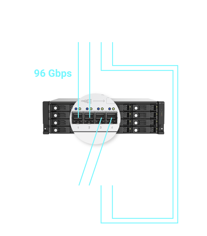 注:NAS 需搭载 QTS 4.5.1 (或以上)/ QuTS hero h4.5.1(或以上) 版本,且需额外安装 PCIe SAS 适配卡。