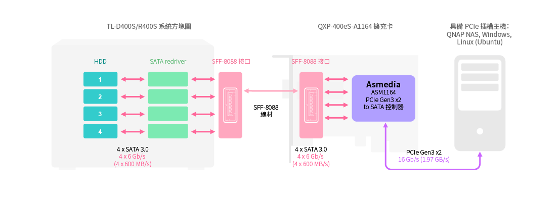 使用 TL-R400S 存储扩充设备,您需搭配专属的 QXP 扩充卡。将其安装于 QNAP NAS、Windows® 或 Ubuntu® 计算机及服务器的 PCIe 扩展槽,再透过 SFF-8088 (或SFF-8644) 传输线与 TL-R400S 串接,弹性扩充存储容量,即插即用,简易又弹性。