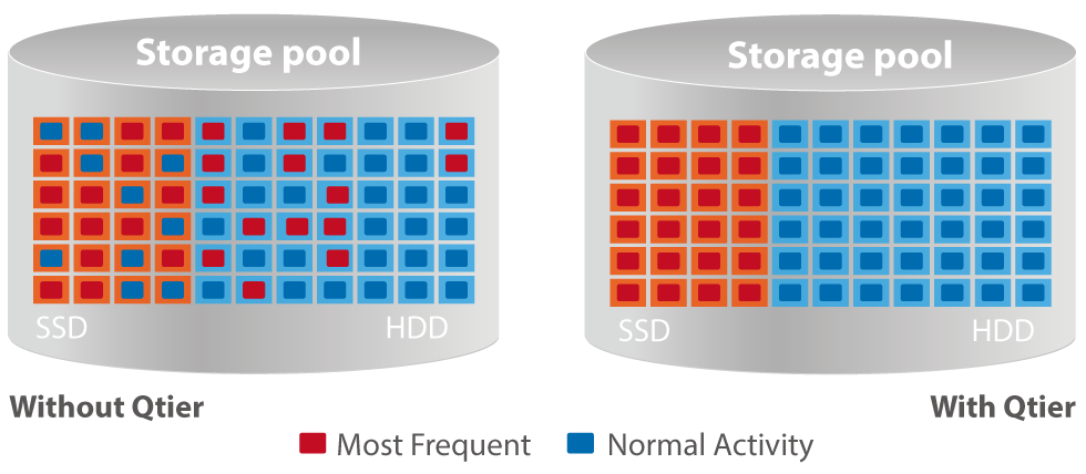 Qtier™ 自动分层存储与 SSD 快取技术,提供 24x7 的全时存储加速。
