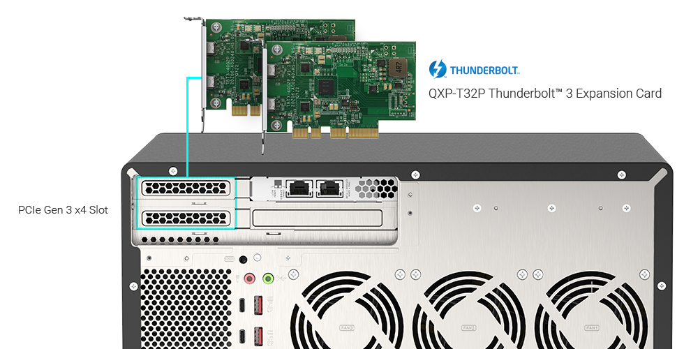 您可同时安装 2 张 QXP-T32P Thunderbolt™ 3 PCIe 扩充卡 (需选购) 于 TVS-h1288X 的 PCIe Gen 3 x4 插槽,成为具 4 个 Thunderbolt™ 3 超高速传输能力端口的 Thunderbolt™ 3 NAS,连接 4 个Thunderbolt™ 端口 Mac® 与 Windows® 工作站,以更效率进行 4K 影像作业、档案存储与快速分享。建议搭配效能型 SSD 建立 RAID 5 以上组态,享受传输效能及存储配置。