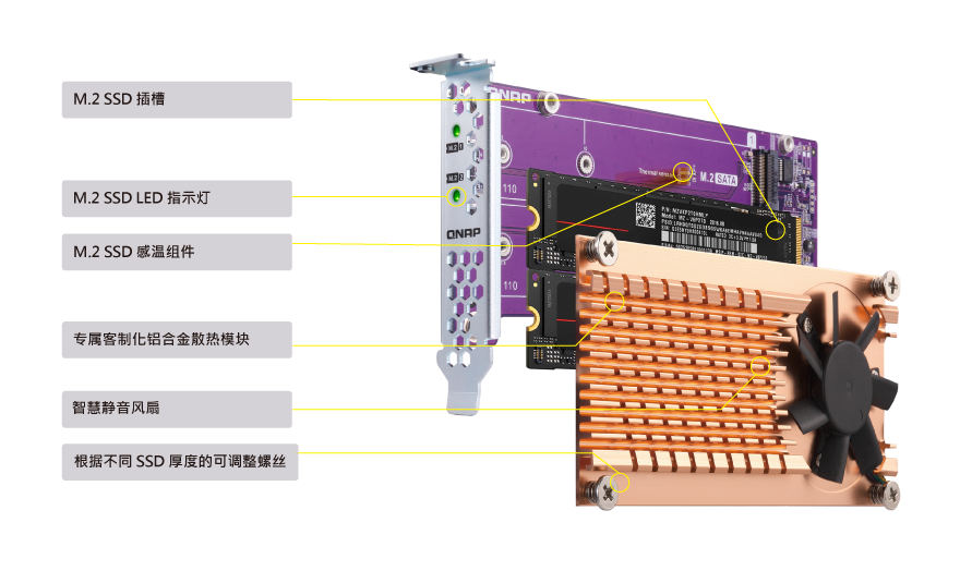 静音散热模块 (含散热片与智能风扇) 快速让 M.2 SSD 降温,以维持文件传输的高效能与稳定性。