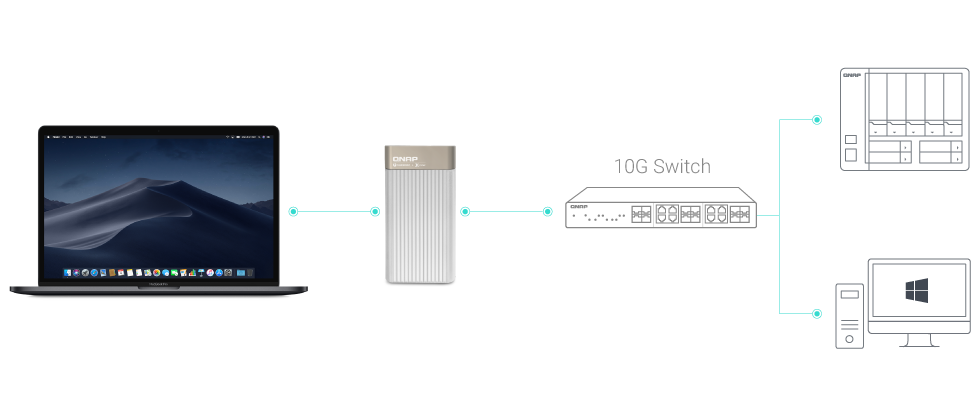 随着影像分辨率从 1080p 不断进化到 4K、8K 等更高画质,媒体工作者进行影像编辑制作时,经常面临存储空间与带宽不足的问题。有了 QNA 系列转换器,带宽问题将迎刃而解。此系列有两款型号:QNA-T310G1T 具备 Thunderbolt™ 3 埠转 10GbE NBASE-T 端口 (支援 10G / 5G / 2.5G / 1G / 100M 五速网络);QNA-T310G1S 具备 Thunderbolt™ 3 端口转 10GbE SFP+ 光纤端口,让您轻松为 Thunderbolt™ 3 设备增添 10GbE 连网能力。再搭配 QNAP 10GbE 交换器,即可为媒体工作室打造经济实惠的 10GbE 网络环境,享有 10GbE 高速文件传输带来的高生产力。