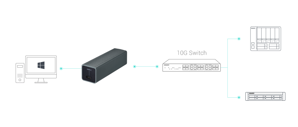 QNAP 提供多样化的网通装置协助企业及家庭用户灵活升级网络环境,以符合日渐增加的带宽需求。有了 QNA-UC5G1T 转换器,带宽问题将可迎刃而解,再搭配 QNAP 10GbE 交换器,即可为您的企业办公室或媒体工作室打造经济实惠的高速网络环境,享受高速文件传输带来的效率。