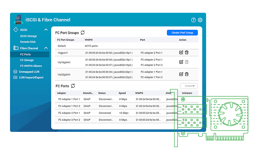 添購新的 SAN 儲存設備價格昂貴,現在您有更划算的選擇。QNAP NAS支援 Marvell® QLogic 光纖通道卡 (Marvell QLogic 2500 系列 8Gb/s)。在 TS-1232XU-RP 上安裝 FC 卡,將其設定為目標模式 (Target Mode),即可將 TS-1232XU-RP 加入既有的 SAN 環境作為儲存裝置。此外,LUN Masking (LUN 遮蔽) 與 Port Binding (端口聚合) 功能更為您的資料提供多一層的安全保護。