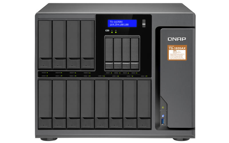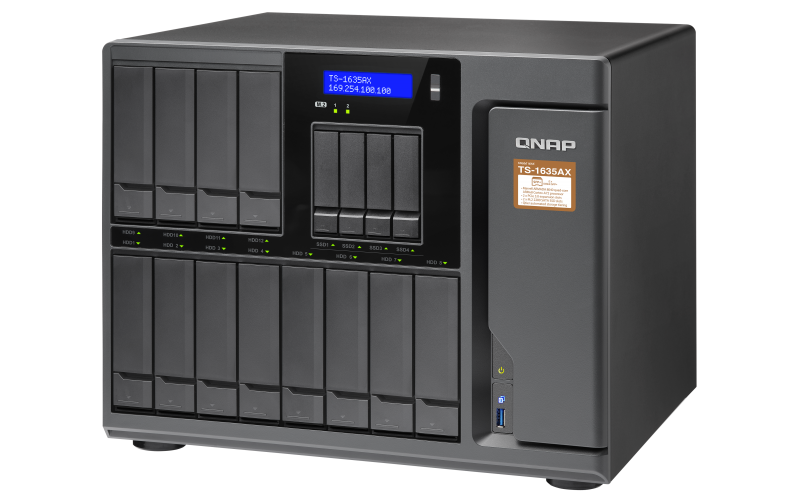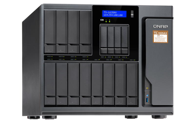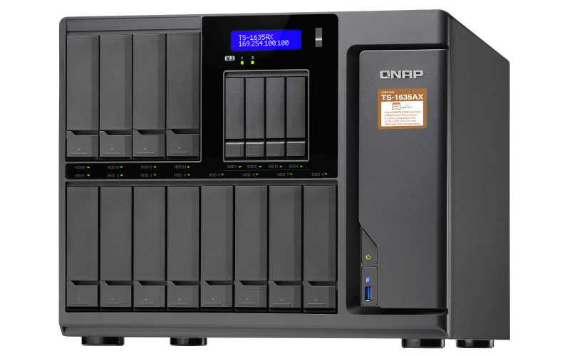 TS-1635AX 提供 4 个 2.5 吋专用硬盘槽及 2 个 M.2 SATA (2280 规格) 插槽,可让您安装高速的固态硬盘 (SSD)*,并启用 QNAP 独家的 Qtier 2.0,为磁盘区和 iSCSI LUN 提供自动分层存储及类快取机制,进一步提升 TS-1635AX 的效能,满足虚拟化及 10GbE 传输等需要高存取效能的应用情境,并让 SSD 及传统硬盘 (HDD) 的存储空间运用达到出色效益。