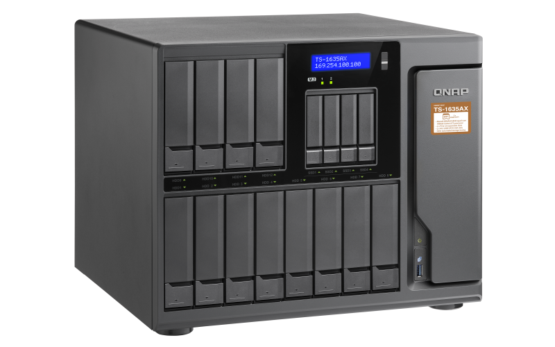 TS-1635AX 携手 Marvell®,采用 ARMADA® 8040 ARMv8 Cortex-A72 64 位四核心 1.6 GHz 处理器,不仅运算效能充沛流畅,更可胜任多种应用情境,协助企业应对持续成长的资料量,确保事业发展顺畅无阻。TS-1635AX 具备 12 个 3.5 吋硬盘槽、4 个 2.5 吋硬盘槽及 2 个 M.2 SATA 插槽,供您部署大容量、出色效能且成本效益更佳的存储空间。同时,TS-1635AX 内建 2 个 10GbE SFP+ 网络端口及 2 个 Gigabit 网络端口,提供高速联机,同时带来网络部署的弹性。TS-1635AX 更拥有 2 个 PCI Express (PCIe) 3.0 插槽供硬件扩充用,可选购 QM2 M.2 SSD/10GbE 扩充卡、QWA-AC2600 无线网络扩充卡,以及 USB 3.2 Gen 2 (10Gbps) 扩充卡,为 NAS 添加额外功能。TS-1635AX 可轻松吞吐海量数据、且运算效能出色,同时具备多样化的扩充能力,让企业以更低的总持有成本 (Total Cost of Ownership, TCO) 坐享新一代存储设备的无穷潜能。