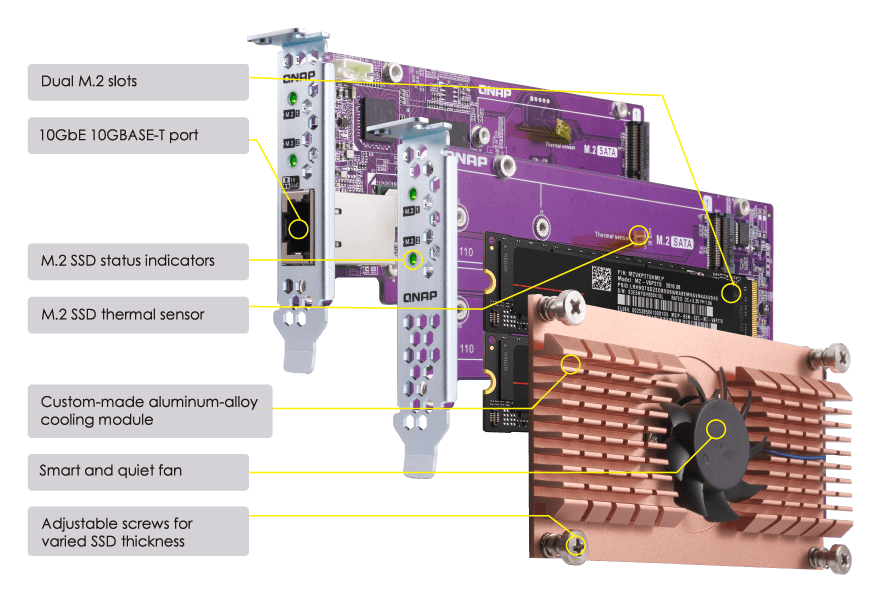 QM2 PCIe 扩充卡系列具备双 M.2 SSD 插槽,部分型号更配备 10GbE 联机功能*。您可通过 QM2 新增 M.2 SSD,轻松部署 SSD 快取或 Qtier,持续扩充 NAS 并提升效能。具备 10GbE 联机功能的型号可让 TS-1635AX 升级支持 10GBASE-T 网络,让 NAS 运用更加多样化。QM2 的专属散热模块可有效带走废热,即使系统长时间全速运作,仍可维持效能,并延长 M.2 SSD 模块寿命。