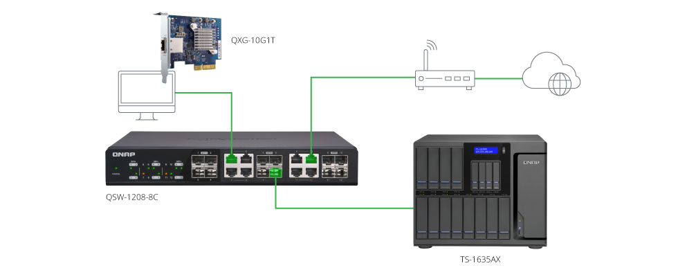 TS-1635AX 支持 10GbE 网络,具备 2 个 10GbE SFP+ 网络端口,无须选购扩充卡即可加速您的工作流。若您的网络环境尚未支持 10GbE,您可选购 QNAP 10GbE/NBASE-T™ 非网管型交换机,打通网络瓶颈,感受更流畅的网络数据存储体验。对于网络环境中的 Windows/Linux 个人计算机,您可选购安装 QXG-10G1T 10GBASE-T/NBASE-T PCIe 网络扩充卡,为个人计算机新增 10GbE 功能,将整体网络架构升级为四通八达的高速环境。