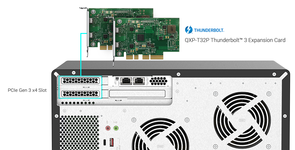 您可同时安装 2 张 QXP-T32P Thunderbolt™ 3 PCIe 扩充卡 (需选购) 于 TVS-h1688X 的 PCIe Gen 3 x4 插槽,成为具 4 个 Thunderbolt™ 3 超高速传输能力端口的 Thunderbolt™ 3 NAS,连接 4 个Thunderbolt™ 端口 Mac® 与 Windows® 工作站,以更效率进行 4K 影像作业、档案存储与快速分享。建议搭配效能型 SSD 建立 RAID 5 以上组态,享受传输效能及存储配置。