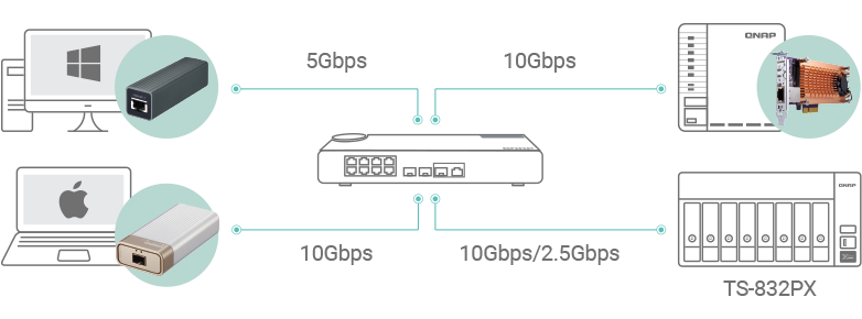 TS-832PX 提供 2 个 10GbE SFP+ 网络端口与 2 个 2.5GbE RJ45 网络端口,支持 Port Trunking 与故障转移,为企业应用带来大带宽传输的优势,充分满足企业对大量文件存取、备份和复原等高带宽作业的需求。搭配 QNAP 旗下多款网管型和非网管型 10GbE/2.5GbE 交换器,以多元的10GbE SFP+/RJ45 复合端口和 Multi-Gigabit NBASE-T™ 支持,用精省预算打造流畅、安全、可扩充的高速网络环境。