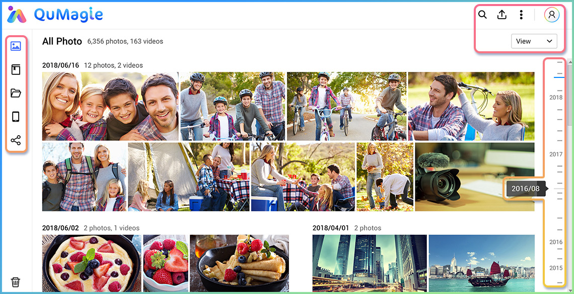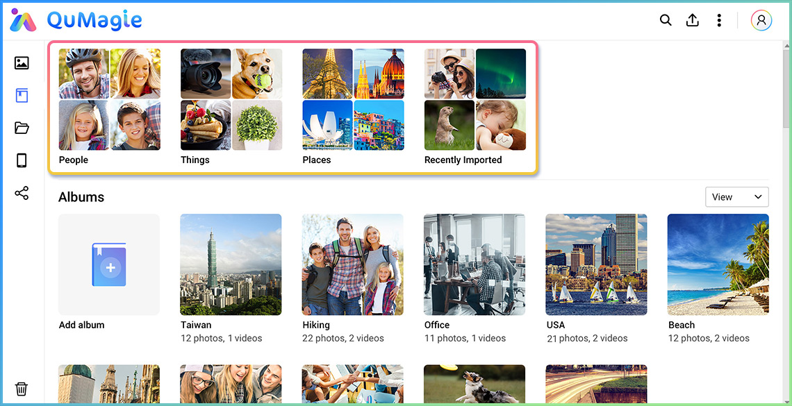 QuMagie 整合 QuMagie Core 人工智能影像辨识引擎,能辨识照片中的人脸及对象,将相似的人物及事物自动组成「人物相簿」及「事物相簿」。同时也能依据拍照地点自动分类照片,您可于「地点相簿」中快速找到各个地点所拍摄的照片。更多实用功能包含:时间轴、自定义文件夹封面、动态播放 iOS® Live Photo,以及更强大的搜寻机制,为您带来更直觉、流畅的照片管理及分享体验。